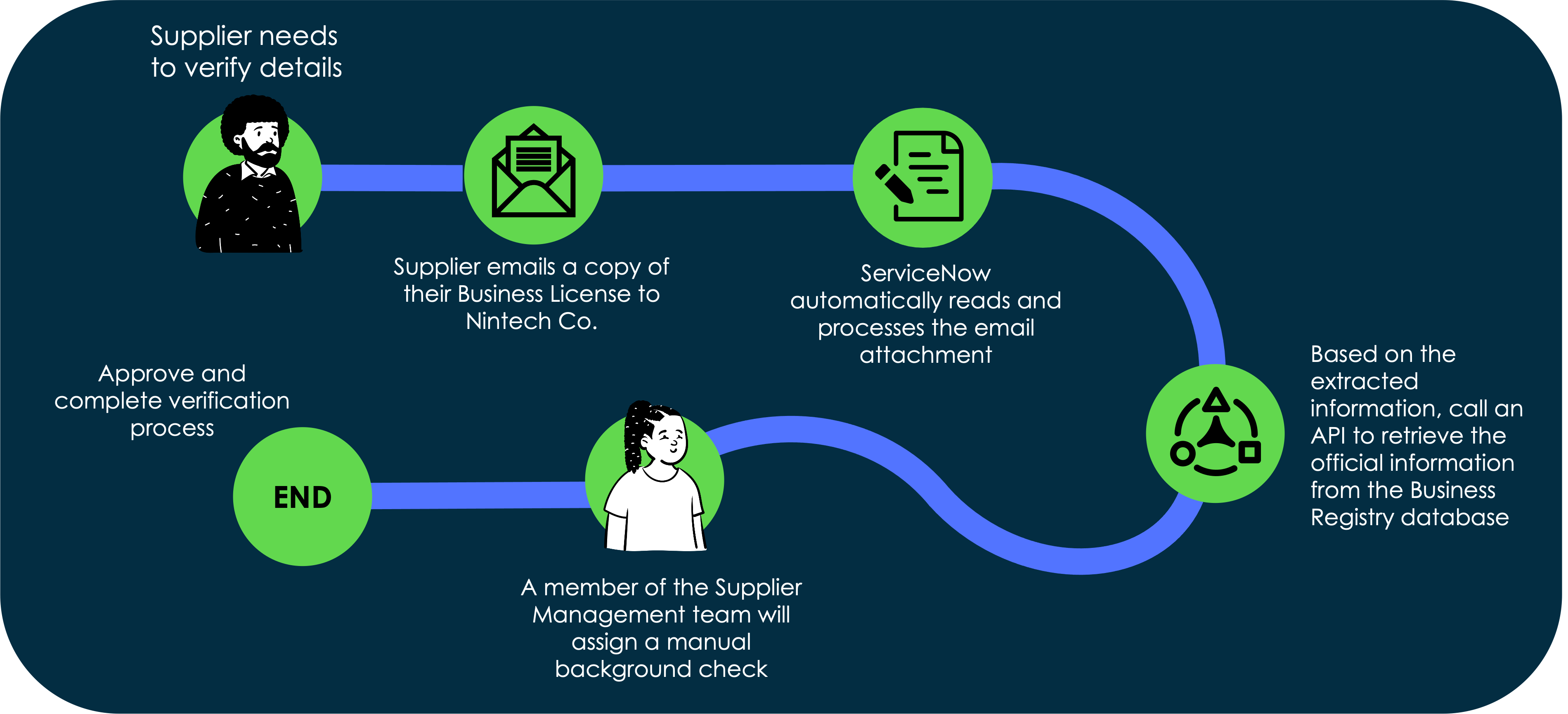 One of these demands is to automate processes within the supplier management department. Due to inefficiencies in the past, Nintech Co. has not only suffered from a protracted onboarding cycle for their enormous catalog of suppliers, but also legal and compliance risks regarding the background of these suppliers. With this in mind, you set out to work on this first project to “hyperautomate” the supplier management processes.