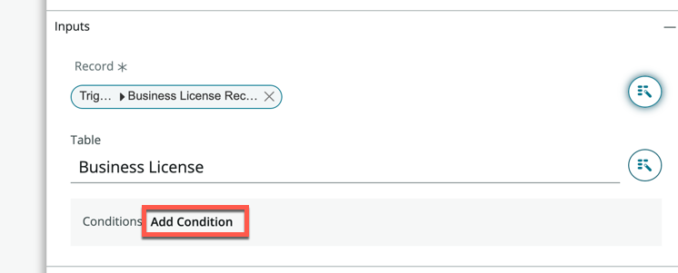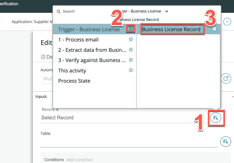12. On the Record field, click the data pill picker (1), expand Trigger - Business License (2), click Business License Record (3)