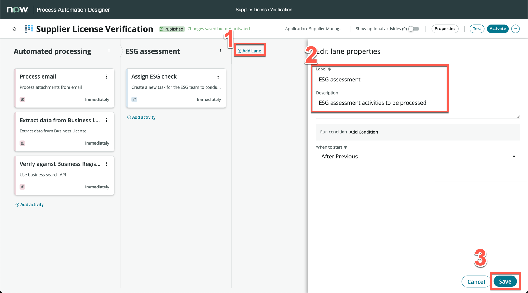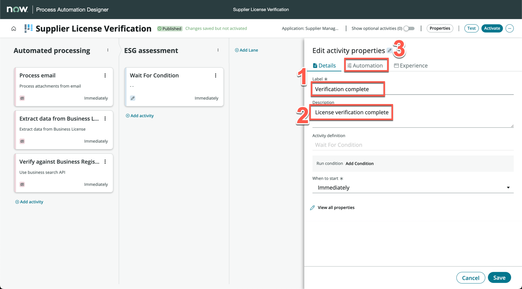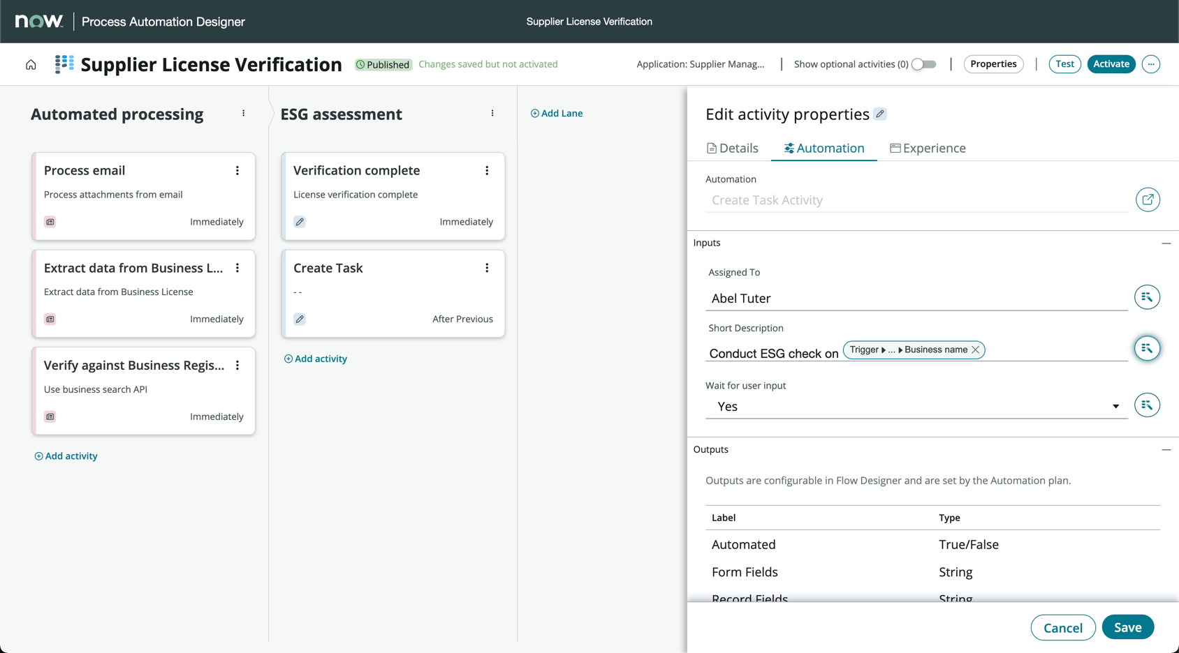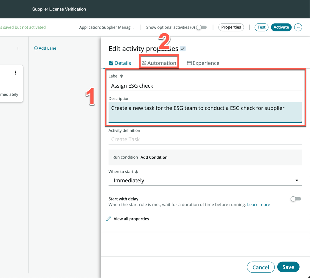 19. On the Activity properties side bar that appears, change the Label to Assign ESG check
