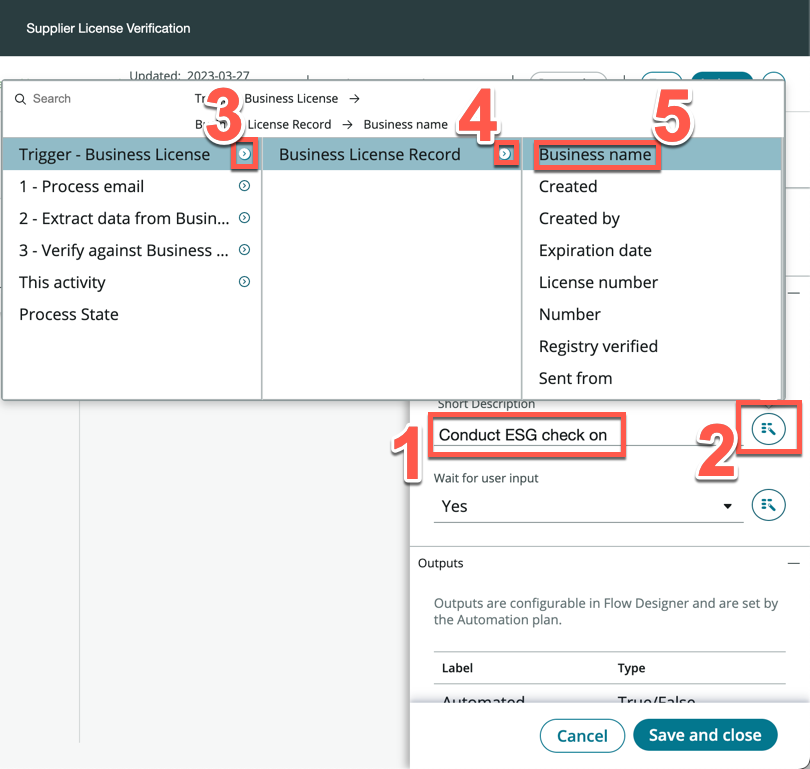 23. Under Short Description, enter Conduct ESG check on - (1), then click the data pill picker (2), expand Trigger - Business License (3), expand Business License Record (4), click Business name (5)