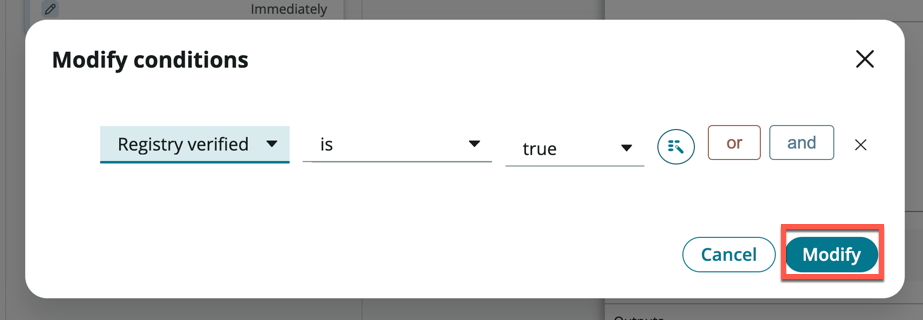 14. On the Modify conditions pop-up, set Registry verified to is true