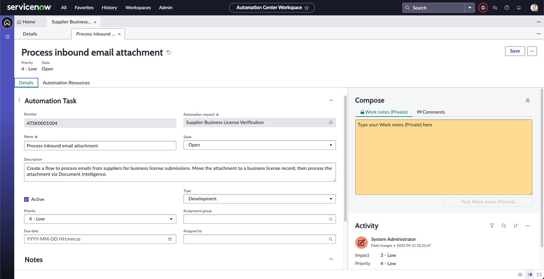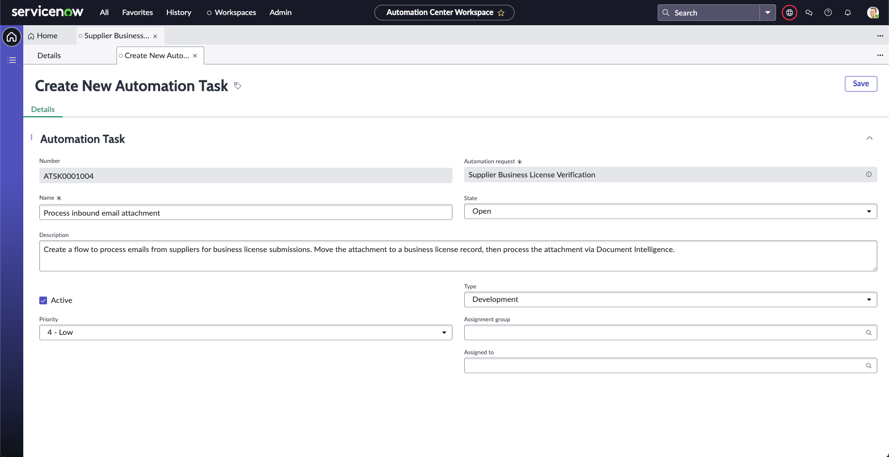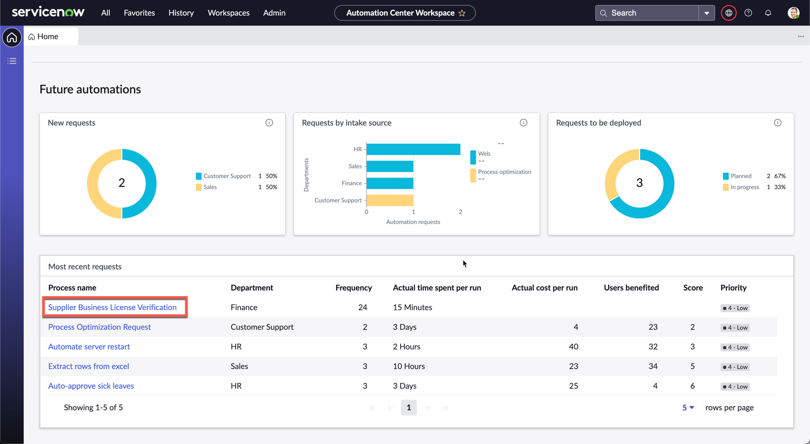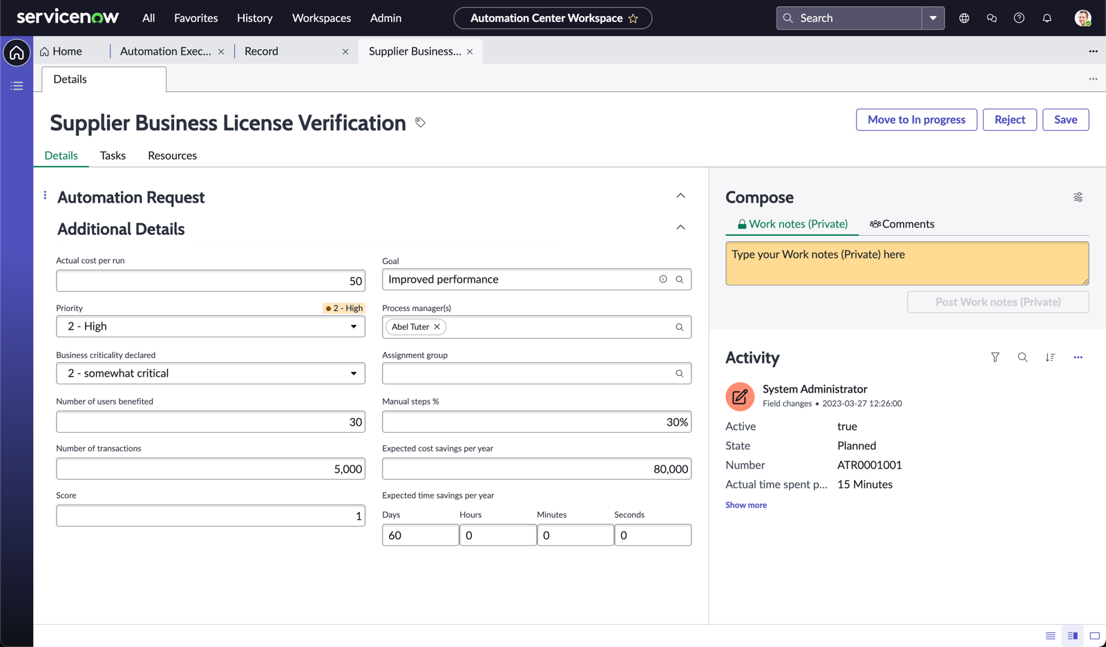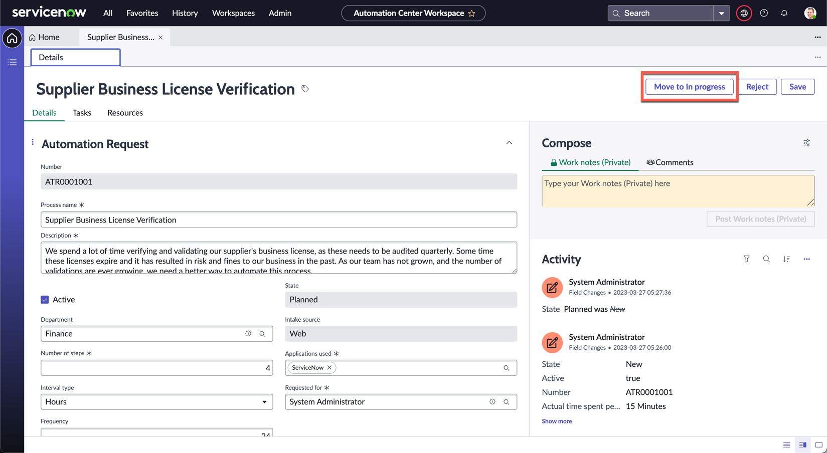 Automation Center enables organizations to discover, prioritize, and manage automation requests from different sources through the full life cycle in a single workspace. Let’s progress this automation request.