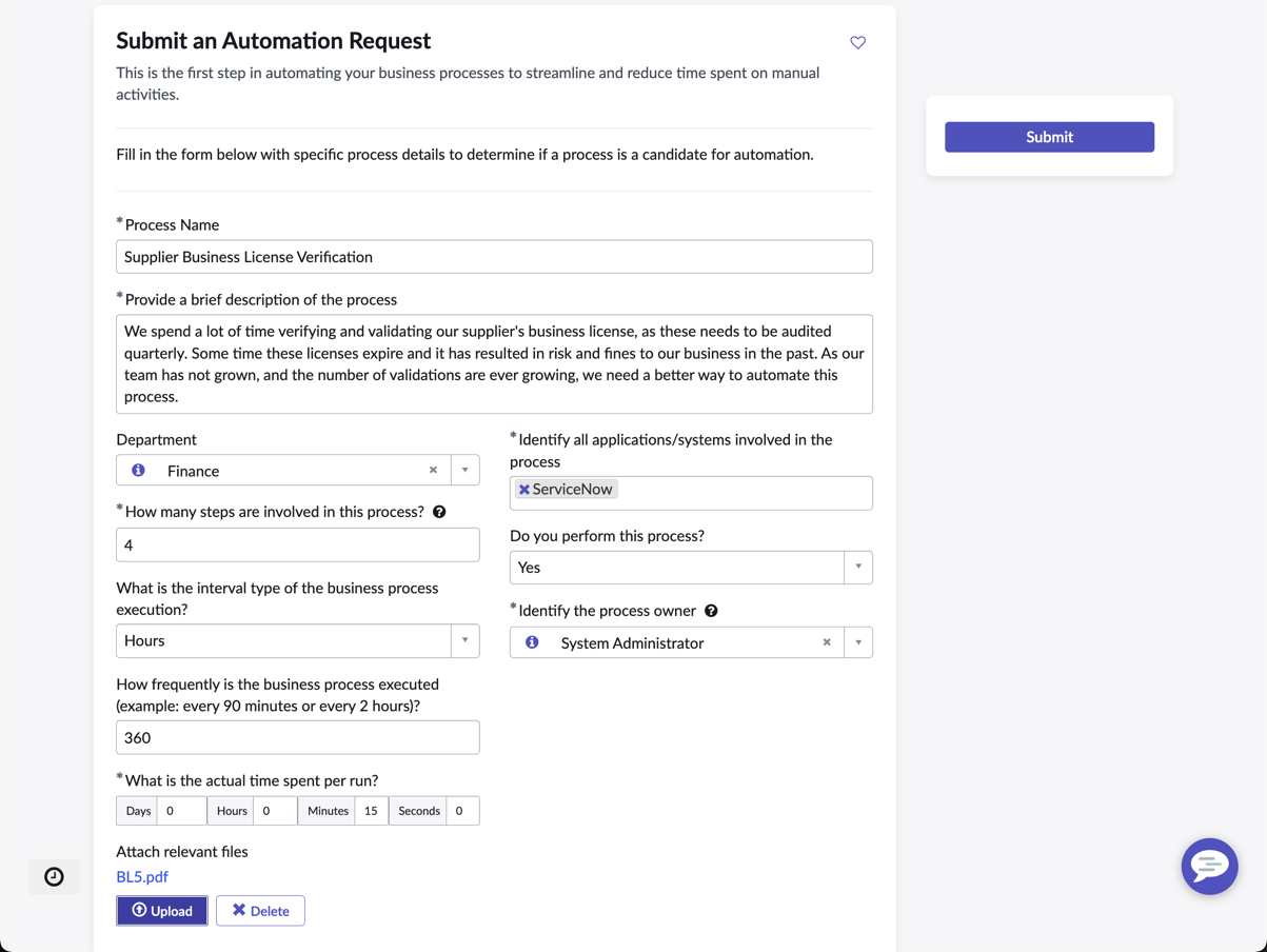 We start off by understanding how this automation request was submitted. One of your colleagues within the Supplier Management function in Finance went to the Employee Center to submit an Automation Request. You can see how the form was filled and submitted in the image below.