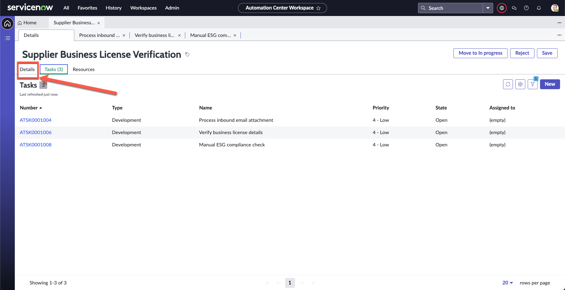 You will see the list of automation requests from the business. Click Supplier Business License Verification (this was the request raised by the Supplier Management team seen earlier)