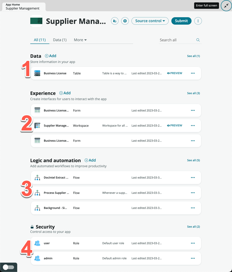 Reference Section Description 1 Data This is where you will add data tables to your custom application, either by creating a brand new table, importing a spreadhseet, extending an existing table, from a PDF file, and even through a data integration. A Business License table has already been created for you. 2 Experience Create access to the custom tables with different experiences, such as via workspaces, catalog items, mobile applications and even standalone portals. Notice that a Supplier Management Workspace was created for you, and you will use this in the final testing exercise 3 Logic and automation Arguably where you will spend the most time during custom application creation. Add Flows, Process Automations, Email notifications and more in this section. You will be building on top of some flows that have been created 4 Security Security is where you will create custom user roles for the application scope. This will not be covered in the context of this lab.
