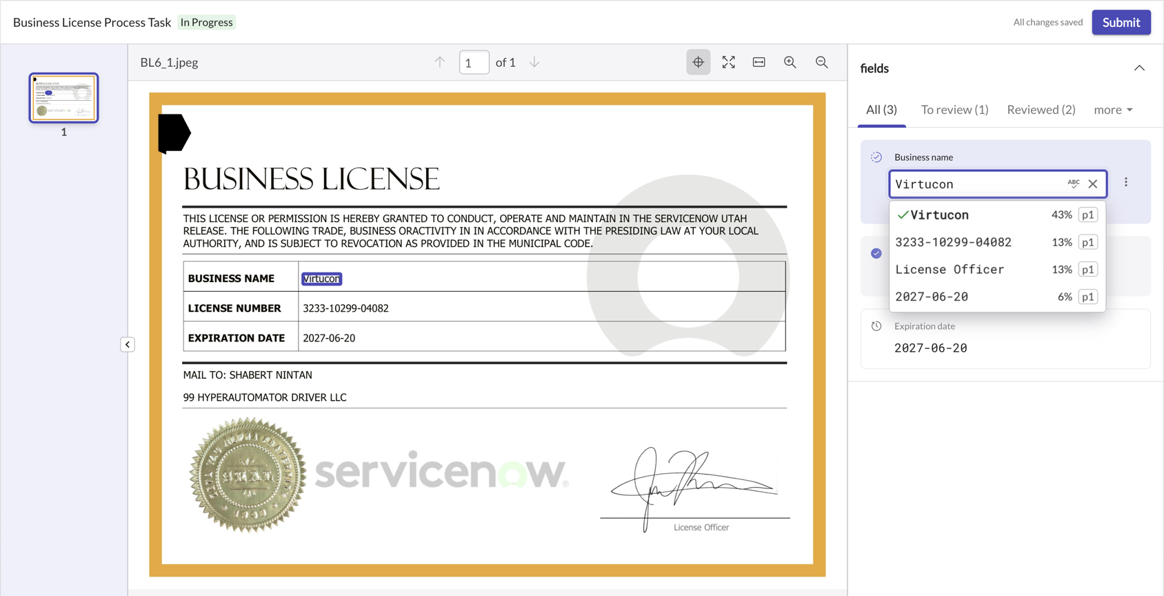(Optional) Enter any word you see from the business license image, and hover on it under the list. This is how you would manually train the AI model, and would be part of the data set once this document in submitted by clicking the button on the top right.