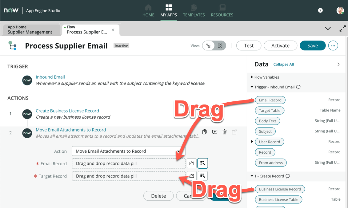 Drag and drop the Email Record data pill from the right data panel onto the Email Record field