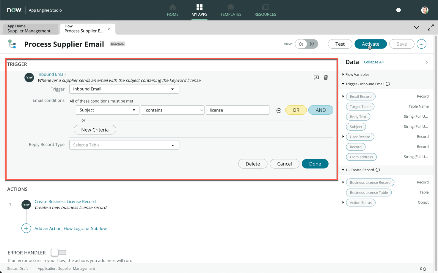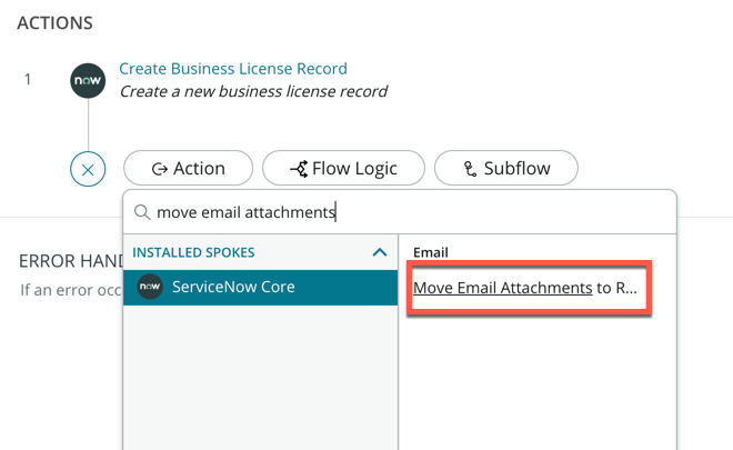 A portion of this flow was already built to create a new Business License record on the custom table. We now have to complete it to shift email attachments onto the record.