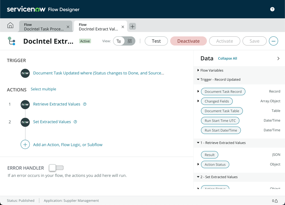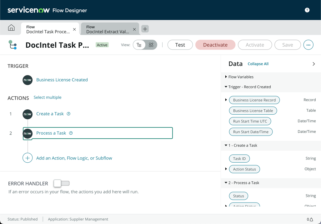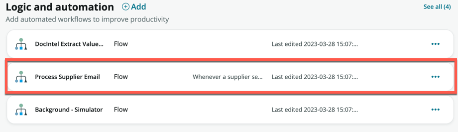 Explanation: Whenever a Business License record is created, it will create a Document Intelligence task to process the attachments against the record. If you recall in the first half of this exercise, the supplier’s inbound email containing the attachment of the business license will then trigger this flow, dynamically processing these tasks everytime an email is received.
