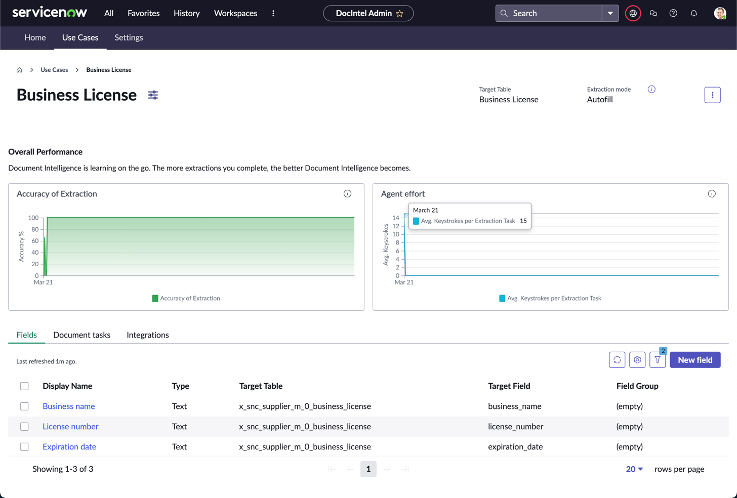 On the right panel, expand the Fields section and click on any field (these are the same 3 fields you saw in the Document Intelligence use case page on the Fields related list)