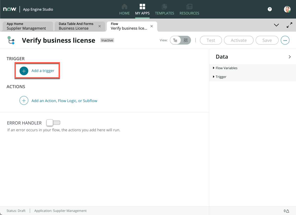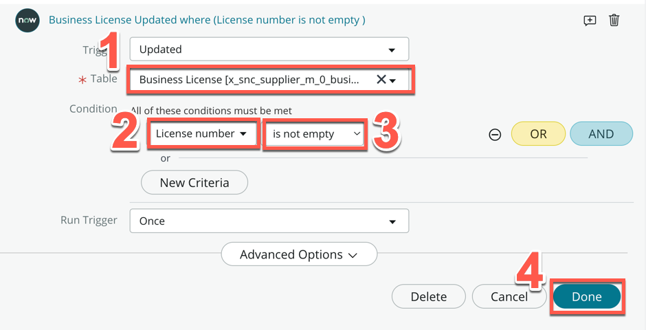 Our trigger condition would be whenever Document Intelligence has processed a document as we saw in Exercise 2. This would be where the Business License Number has been extracted from the attachment.