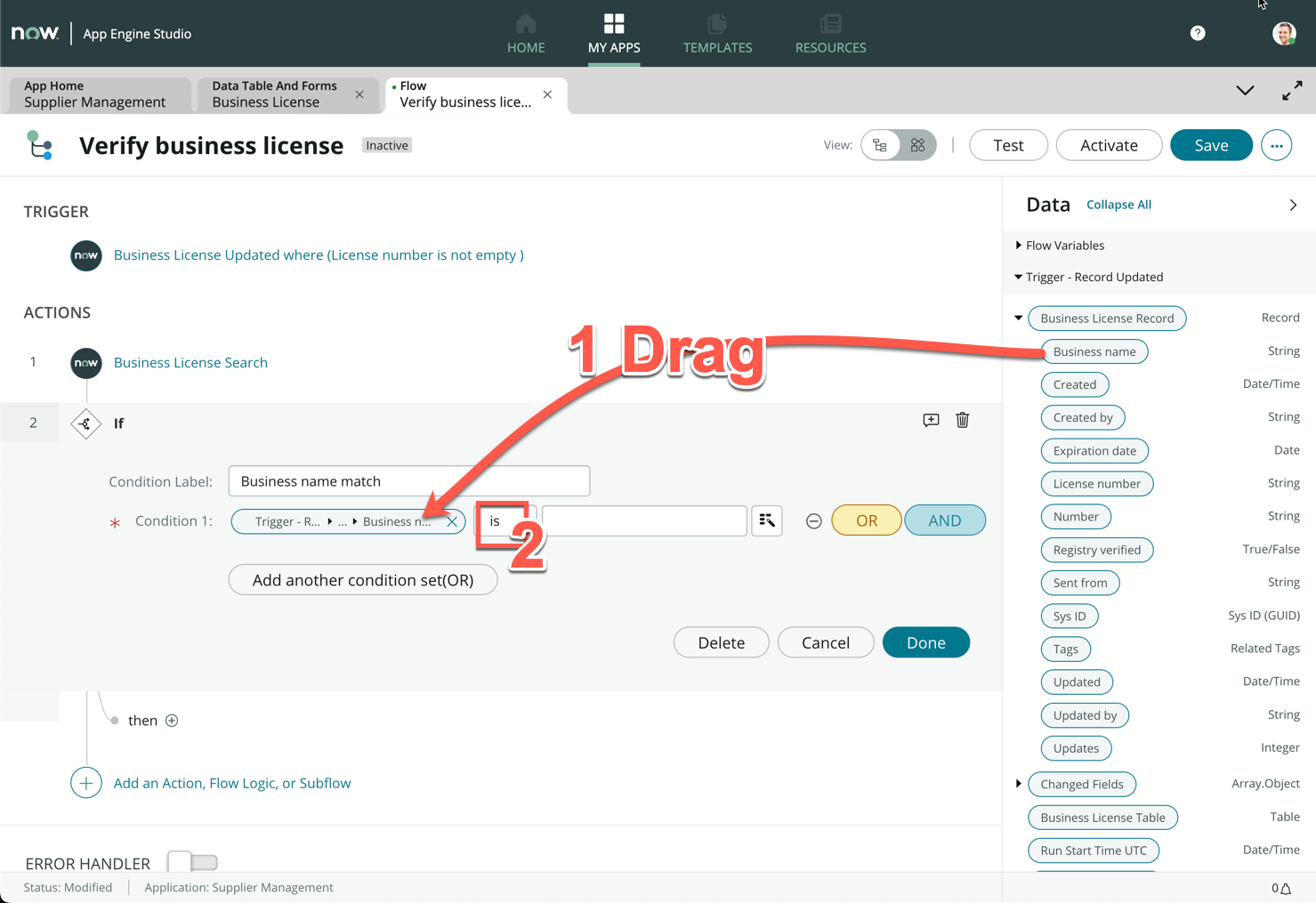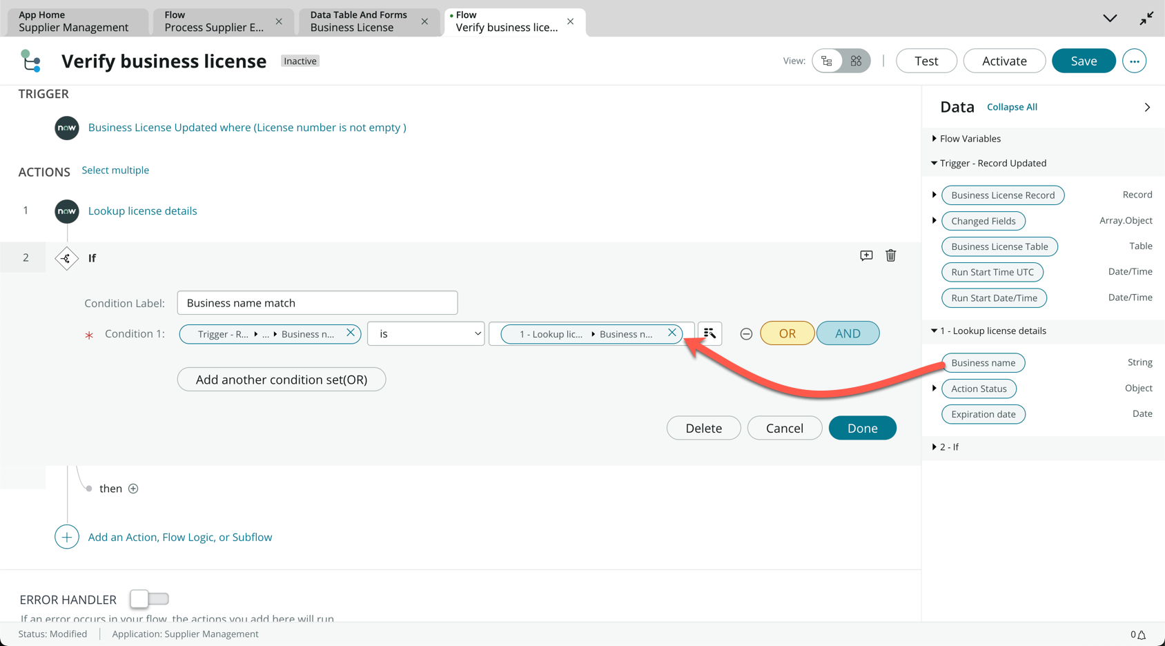 Expand the Business License Record data pill, then drag and drop Business name data pill onto Condition 1 (1)