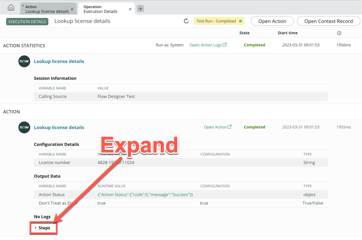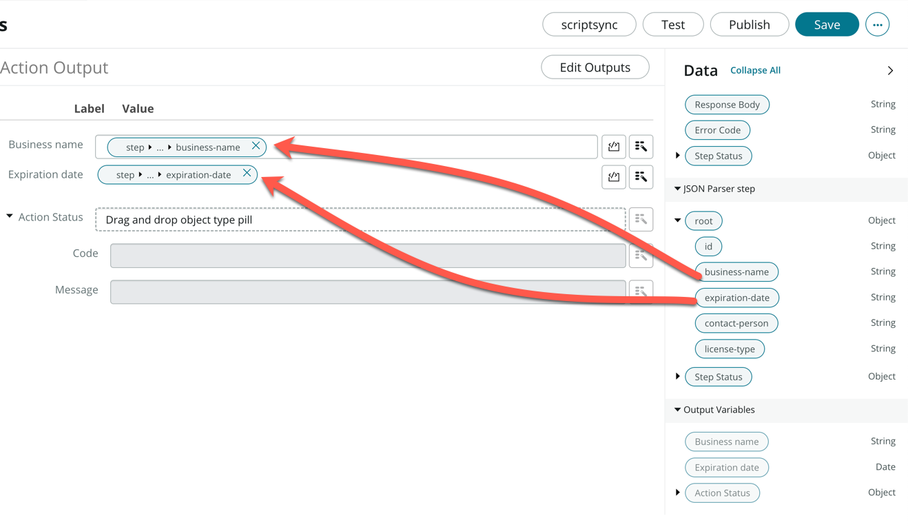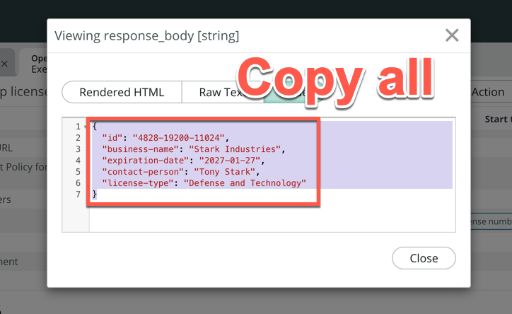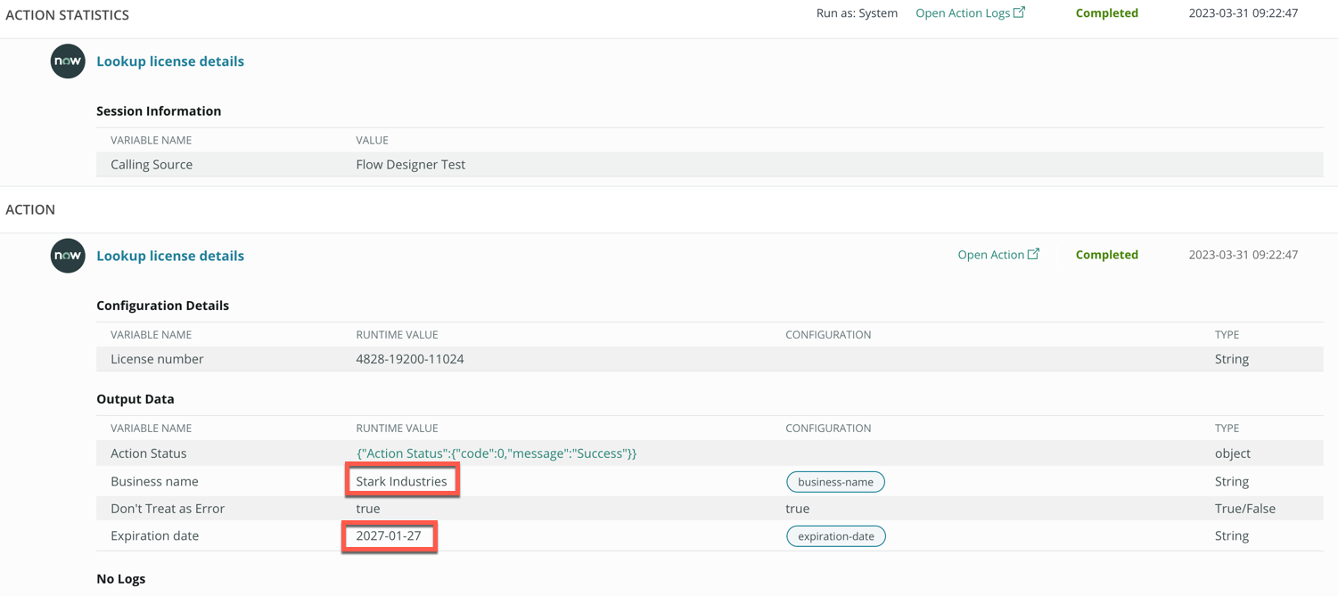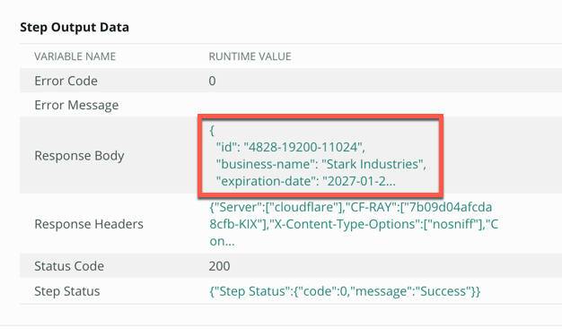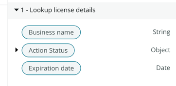 On the right data panel, examine the 1 - Lookup license details data section. The two outputs, Business name and Expiration date were our outputs defined from the API call we created