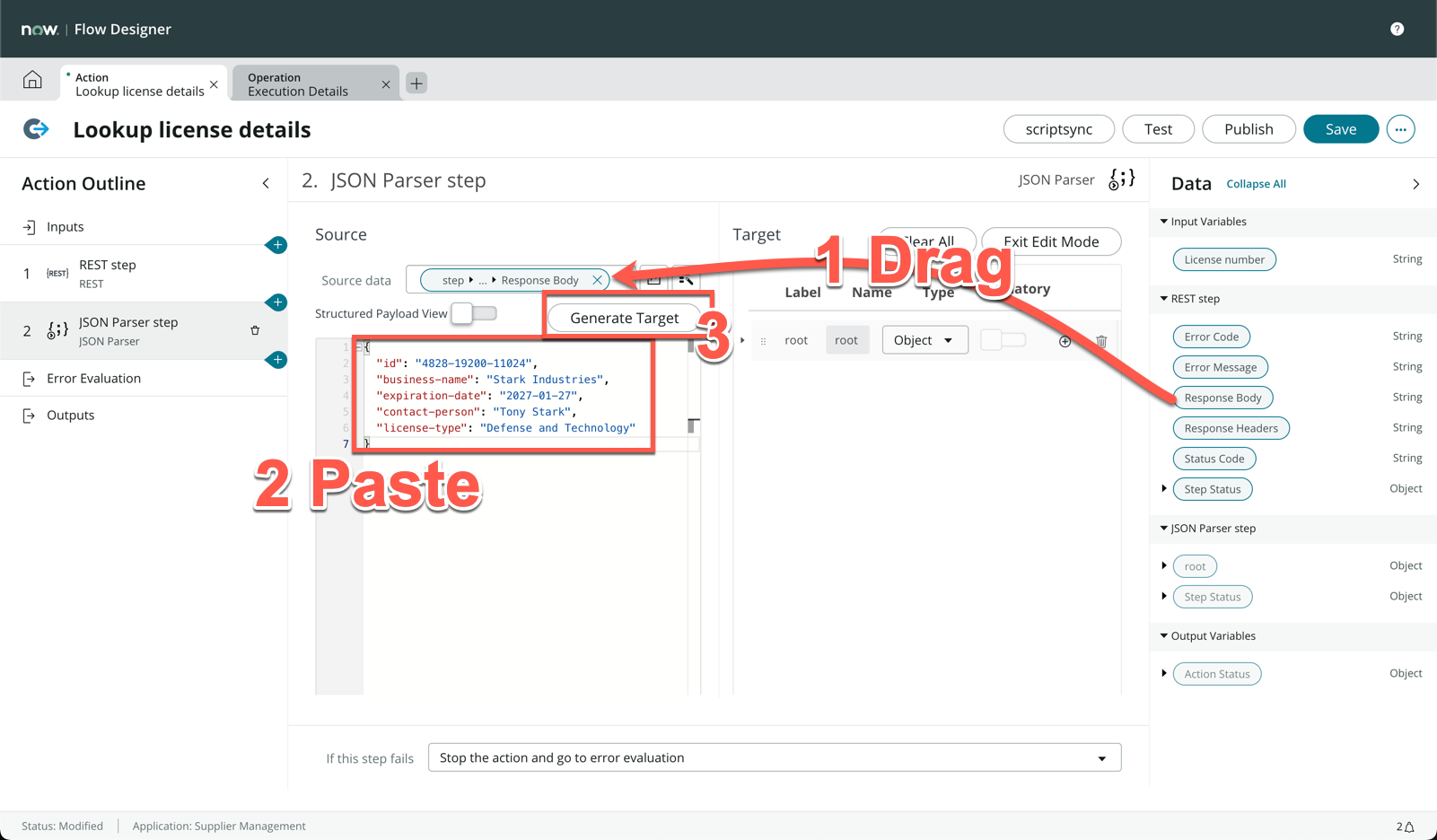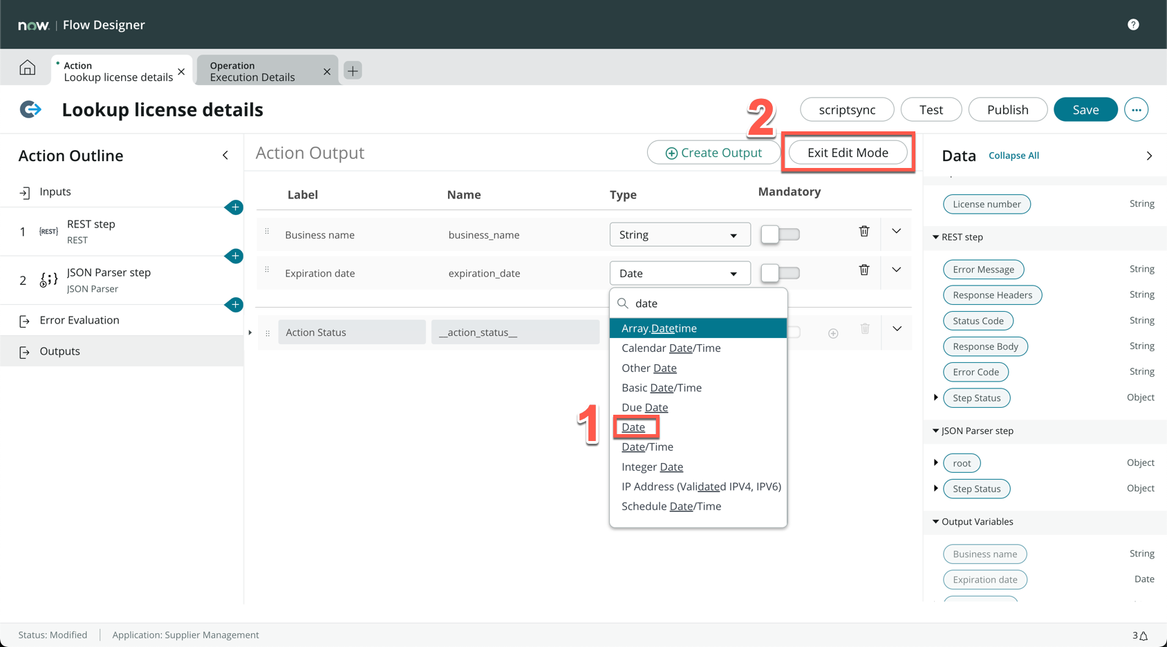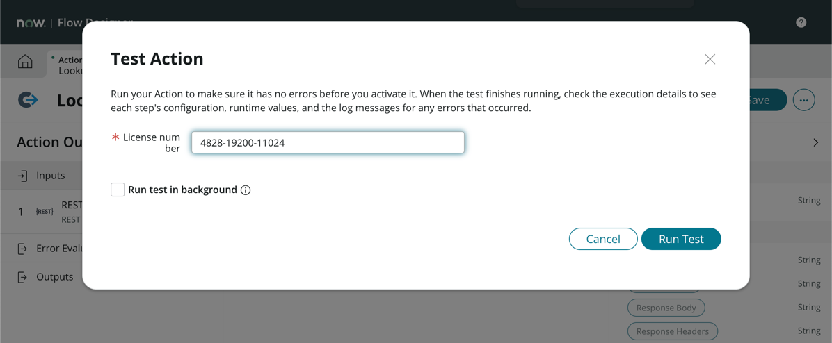 On the right data panel, examine the 1 - Lookup license details data section. The two outputs, Business name and Expiration date were our outputs defined from the API call we created