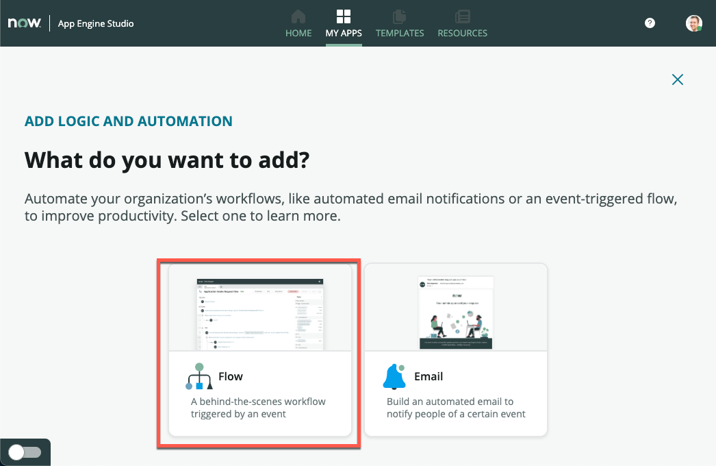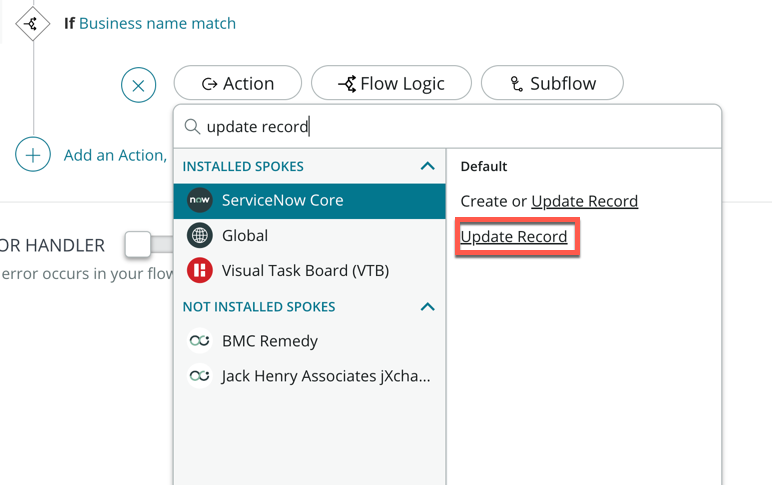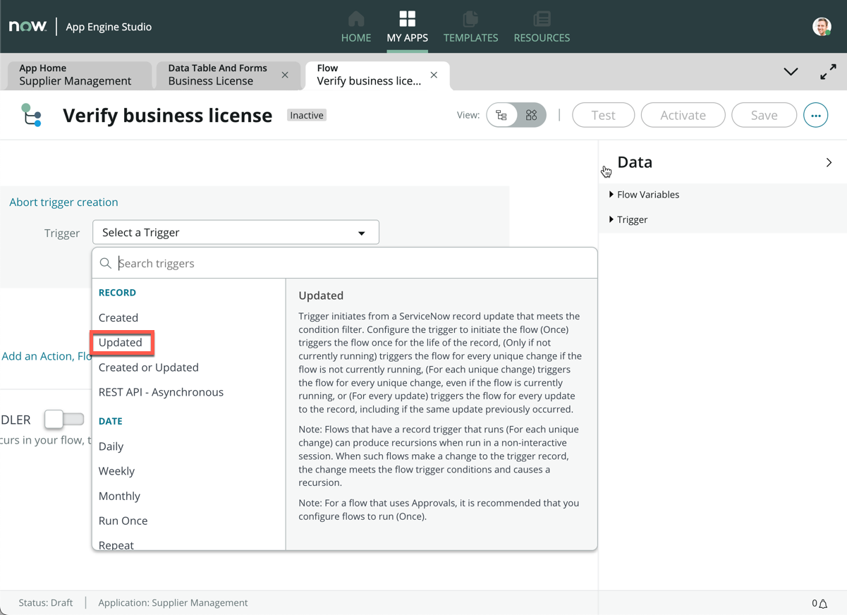 We want this flow to be triggered when a record on our Business License table is updated. Choose Updated under the Record section