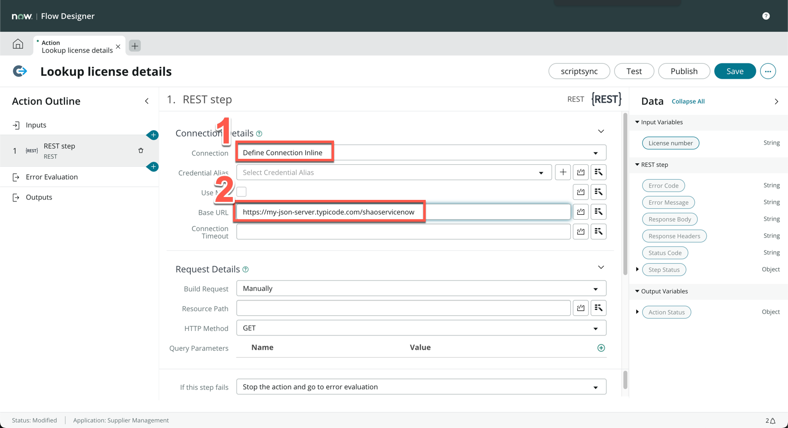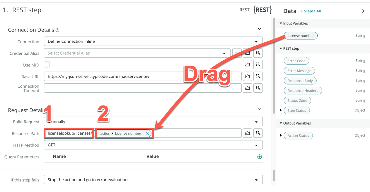 On the new REST step action screen, change Connection to Define Connection Inline (1)