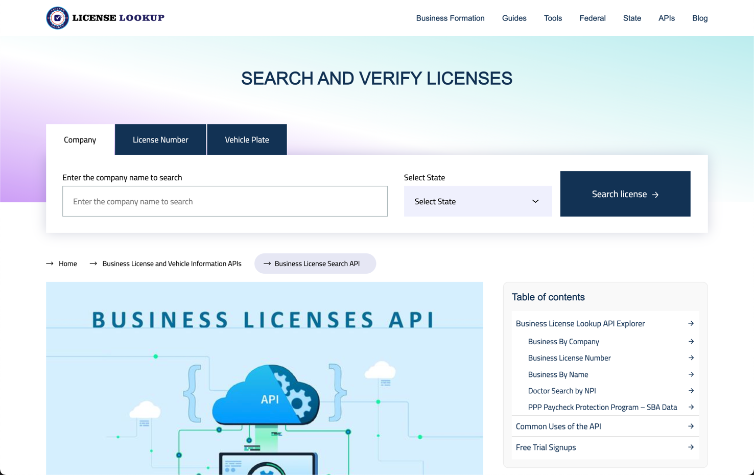 In the lab, we will simulate calling a simulated API, which is modeled after an actual API provider: License Lookup. Check it out here: https://apis.licenselookup.org/business-license-search-api/