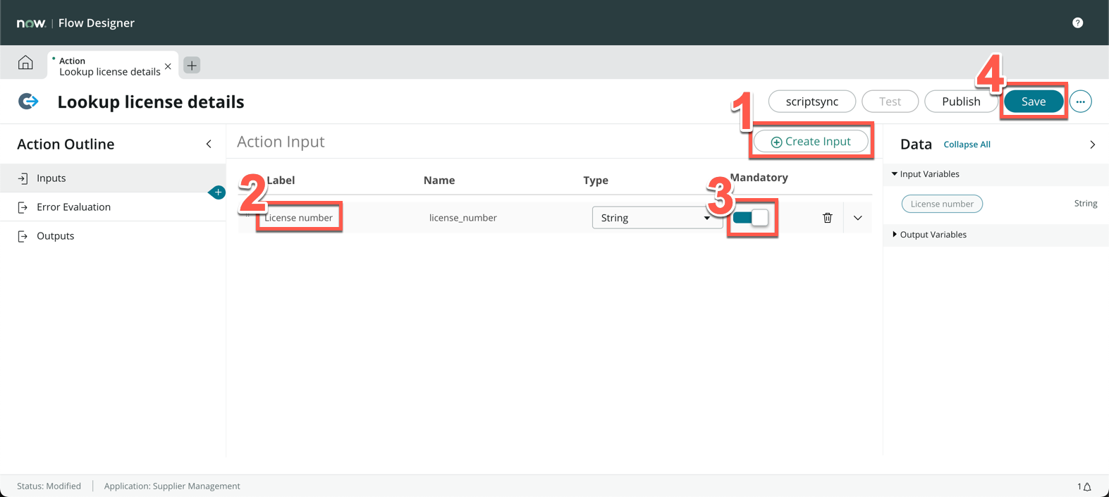 In the pop-up modal, there should be one input field for License number as your defined in inputs. Enter the number 4828-19200-11024