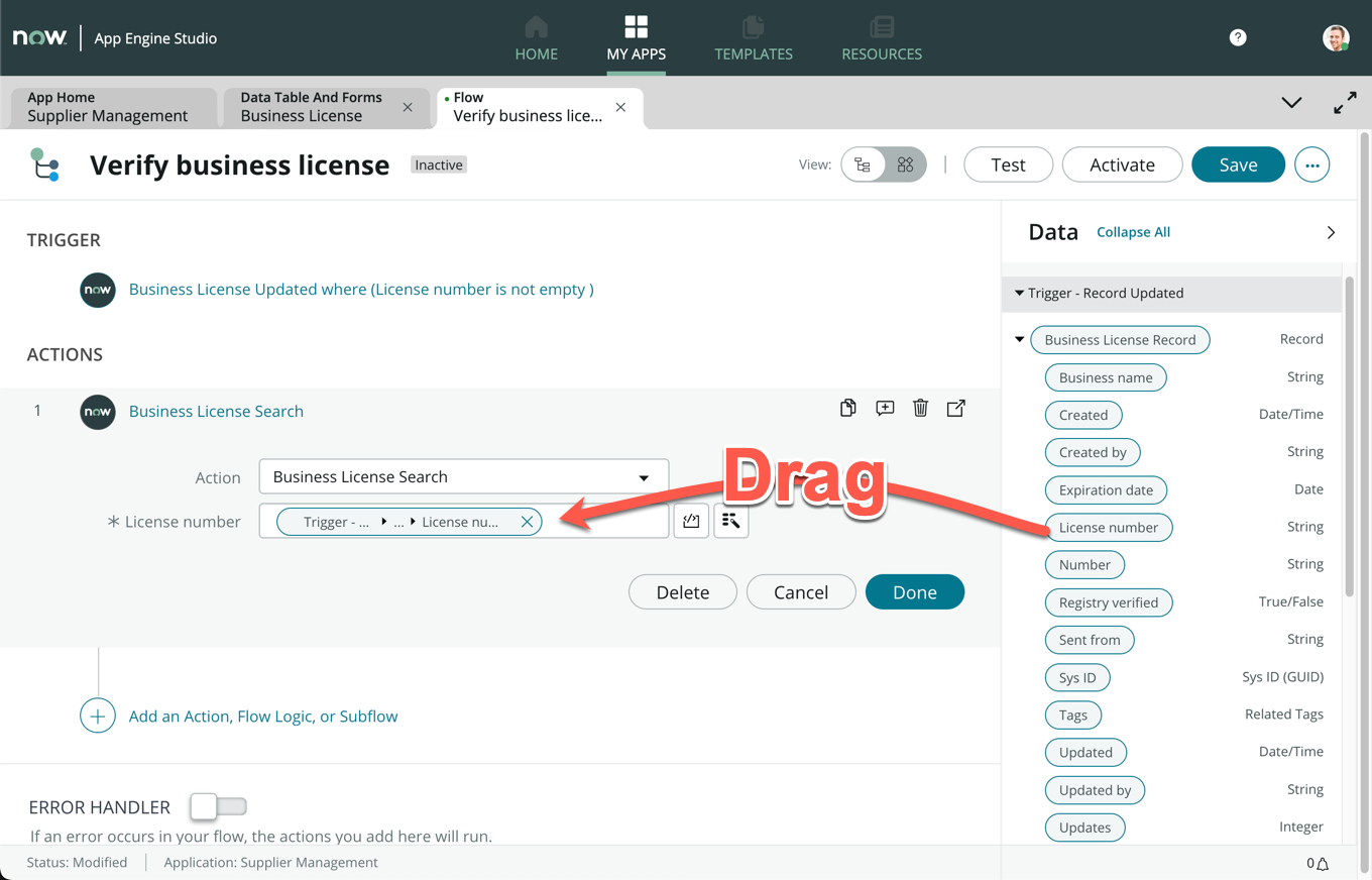 From the right data panel, expand Business License Record, then drag and drop License number onto the License number field