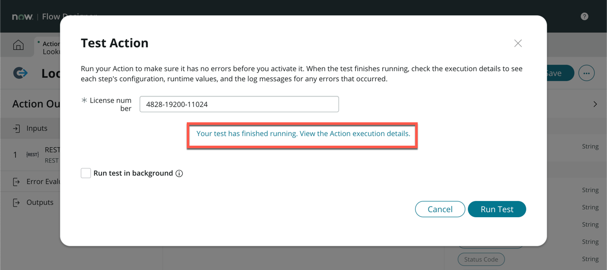 Once the processing is complete, click Your test has finished running. View the Action execution details.